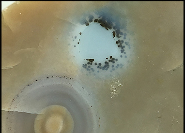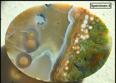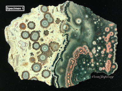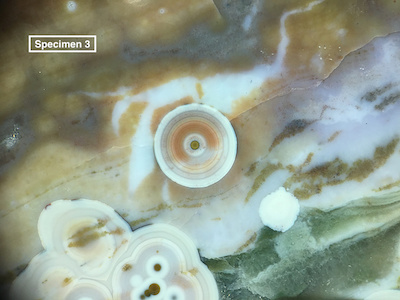 Color zoning in the Ocean Jasper matrix is ubiquitous in specimens, and can occur on large and small scales. Two examples of large scale matrix color zoning are shown above, Specimen 1 with a white to green opaque matrix transition, and Specimen 2 with a white to green opaque to gray bluish-yellowish translucent transition. These may appear to some as a "layer", but they are more aptly classified as a broad matrix color zone that occurs in a nonequilibrium fluid medium due to chemical differences, and this is supported by lab characterization studies of samples from each of the matrix zones in Specimen 2. Specifically, the green zone shows much more concentration of (green) iron content than the white opaque or yellowish translucent zones, as measured by a scanning electron microscope (SEM) with an energy-dispersive x-ray (EDX) detector.