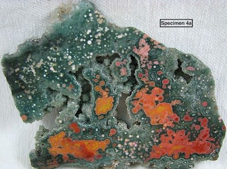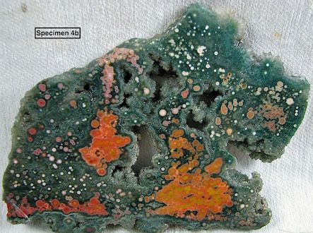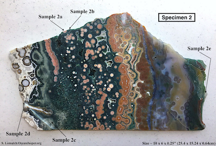 Crystal structure zoning is also ubiquitous in Ocean Jasper specimens, as evidenced by Specimen 2, with two relatively opaque matrix color zones and one relatively translucent. Though all three zones have clearly defined canonical quartz crystallographic structure, as evidenced via powder x-ray diffraction (XRD) sample testing, the latter translucent samples tested out with slightly different peak strengths commensurate with a translucent chalcedony, and the former two with peak strengths commensurate with macrocrystalline quartz (these were compared in my Mindat study to standards published in the referenced research literature). The "holes" in Specimen 4a-b showing more predominant macrocrystalline quartz structure are a result of a gel-sol fluid hardening under the condition of a lower water concentration, with an inhomogeneous spatial contraction of hardening material. Such a phenomenon occurs over large scales in some Ocean Jasper specimens, such as Specimen 4a-b, or on a smaller isolated scale, such as Specimen 2. Quartz druzy pockets and growth on botryoidal chalcedony habits are quite common in most Ocean Jasper specimens.