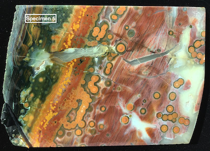 All of this leads to the question of whether Ocean Jasper is formed from a supercooled, supersaturated ferrous-silica solution with nonequilibrium density fluctuations and impurities, or some other model. I discuss this at length in the published book, and I've mentioned in several posts on this website and on Instagram that later weathering and intrusion of impurities are indeed possible after the first hardening phases. Two prime examples are the observation of silica solution backfilling in brecciated Ocean Jasper, as in Specimen 5, and mossy inclusions in post hardening gaps in spherulites, as in Specimen 6. These observations are from relatively non-invasive post-hardening weathering.